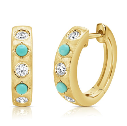 Brinco Argola 10mm de diâmetro interno com Turquesa e Diamantes em Ouro Amarelo 14k